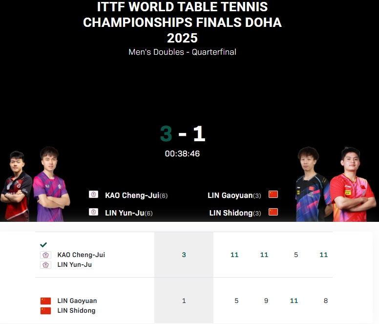 创造耻辱纪录!国乒男双全军覆没,50年来首次无缘世乒赛四强 频道:综合报道 日期:2025-05-23 浏览:41 05月22日讯 世乒赛男双1/4决赛,林高远/林诗栋1-3不敌林昀儒/高承睿,止步8强,另一对国乒组合黄友政/梁靖崑在1/8决赛同样不敌林昀儒/高承睿被淘汰,国乒男双本届世乒赛全军覆没。据统计,这是国乒男双50年来首次无缘世乒赛四强,自从1975年世乒赛以来,国乒从未无缘过世乒赛男双奖牌。 关键词:男双世乒赛 上一篇:?张本智和世乒赛前称冠军该轮到自己了,如今止步男单32强 下一篇:38岁后首胜!ATP250日内瓦站:德约科维奇2-0阿纳尔迪,锁定四强 相关文章 法拉利实现勒芒三连冠,中国车手叶一飞今年随车队登顶 丁俊晖:赵心童夺冠对中国来说非常重要 希望能够突破自己的成绩 上岸稳了!王皓参加先农坛体校教练招聘考试,笔试成绩第一 官方:俄罗斯体操联合会通报,宣布俄运动员重返国际赛场